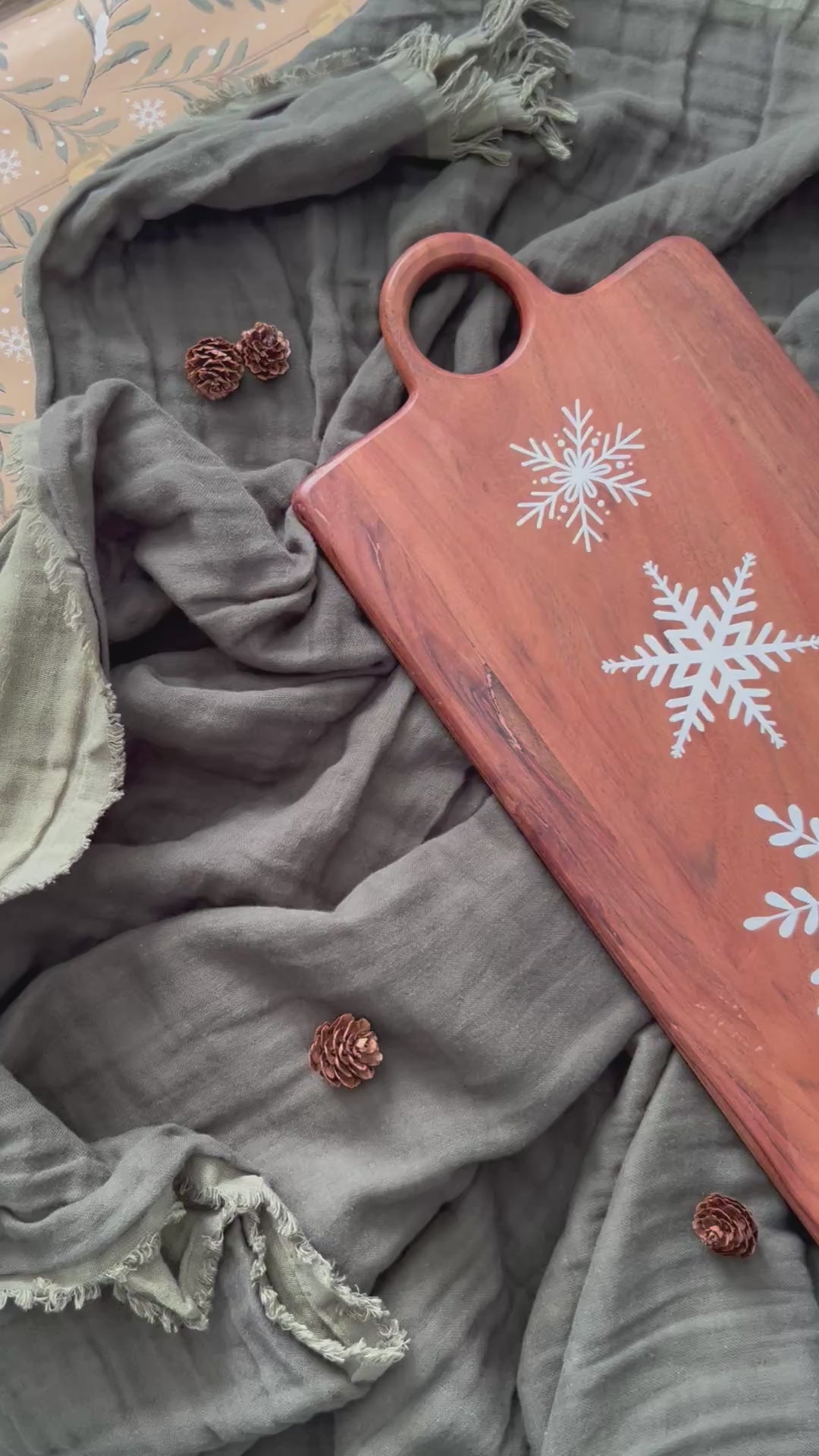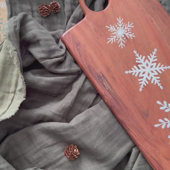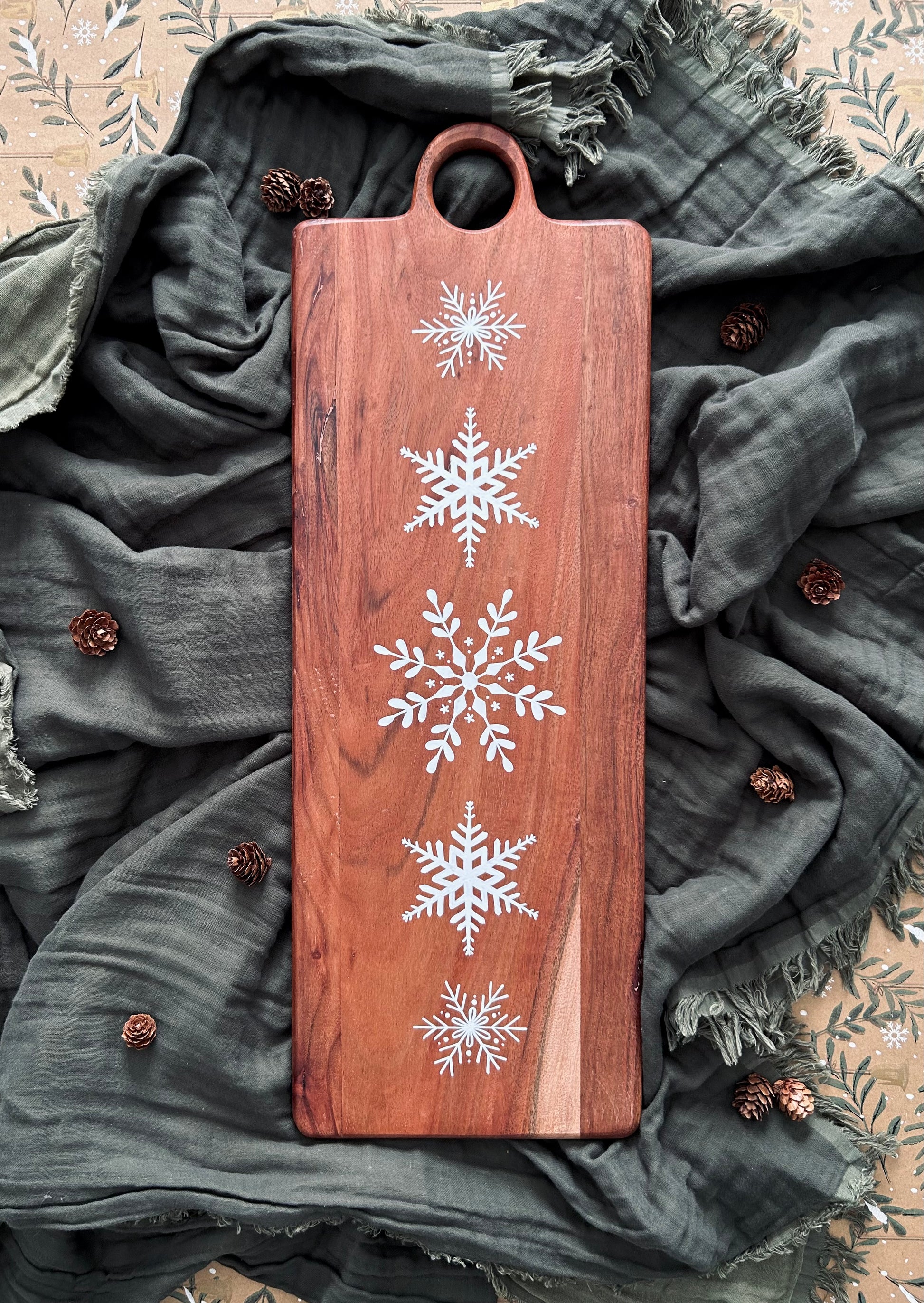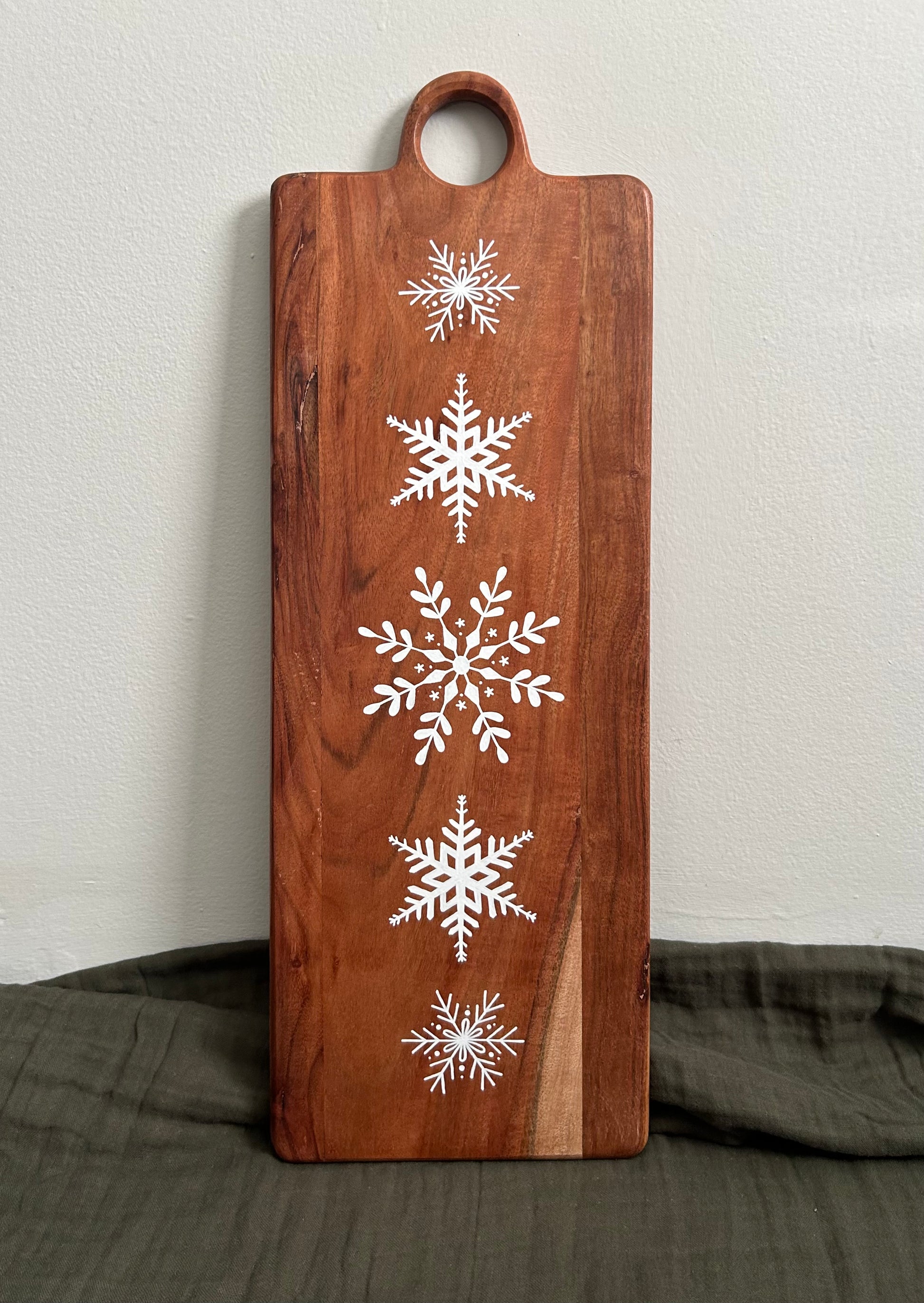 These delicate, white snowflakes are painted on a beautiful acacia wood board (8x24). It could be a gorgeous winter decoration in your home or a perfect gift!